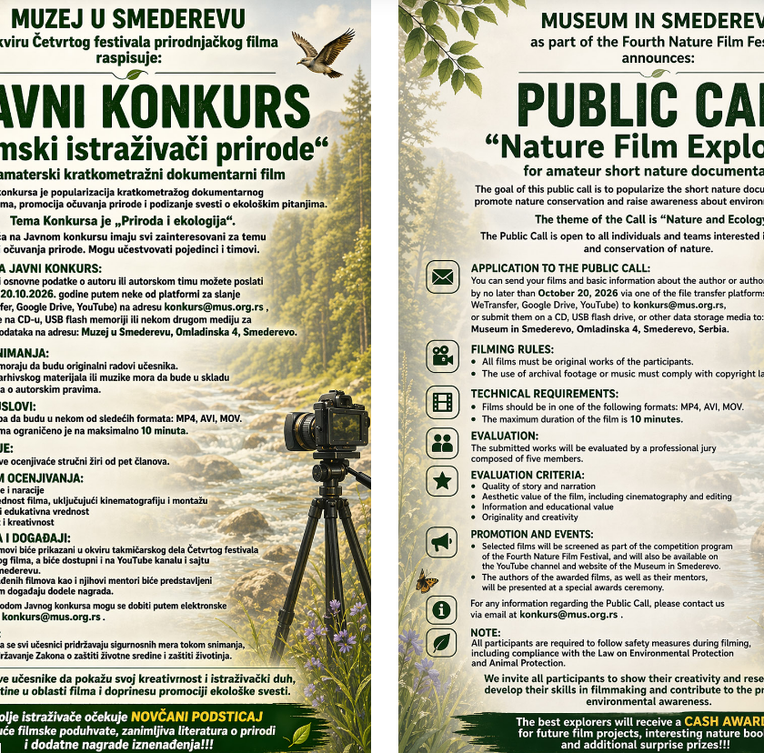 Музеј у Смедереву позива све љубитеље природе и филма да учествују у јединственом конкурсу посвећеном истраживању и очувању природног света. Кроз краткометражни документарни филм, учесници имају прилику да изразе своју креативност и укажу на значај екологије. Награђени филмови биће приказани на Четвртом фестивалу природњачког филма, који ће бити одржан у новембру 2026. године.