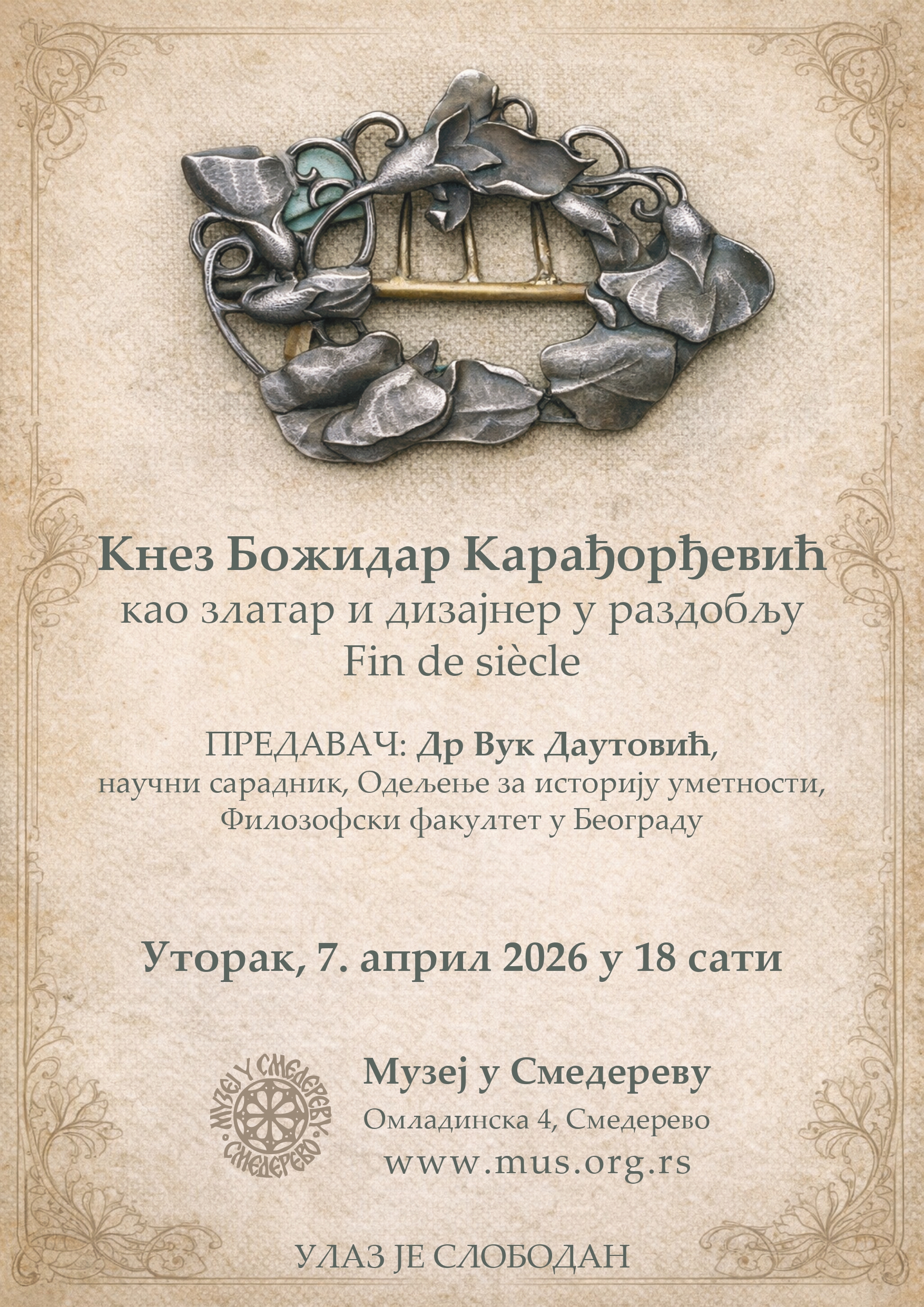 У оквиру програма који се организује поводом Дана Музеја у Смедереву, др Вук Даутовић, научни сарадник Одељења за историју уметности Филозофског факултета у Београду, у уторак, 7. априла са почетком у у 18 сати одржаће предавање на тему:„Кнез Божидар Карађорђевић као златар и дизајнер у раздобљу Fin de siècle“. Музеј у Смедереву је међу ретким музејима у Србији који у својој ризници чува сребрну копчу за појас, јединствен рад Божидара Карађорђевића, из 1900. године, поклон Милана Јовановића Стојимировића из 1963. године, а који је он пак добио на поклон од…