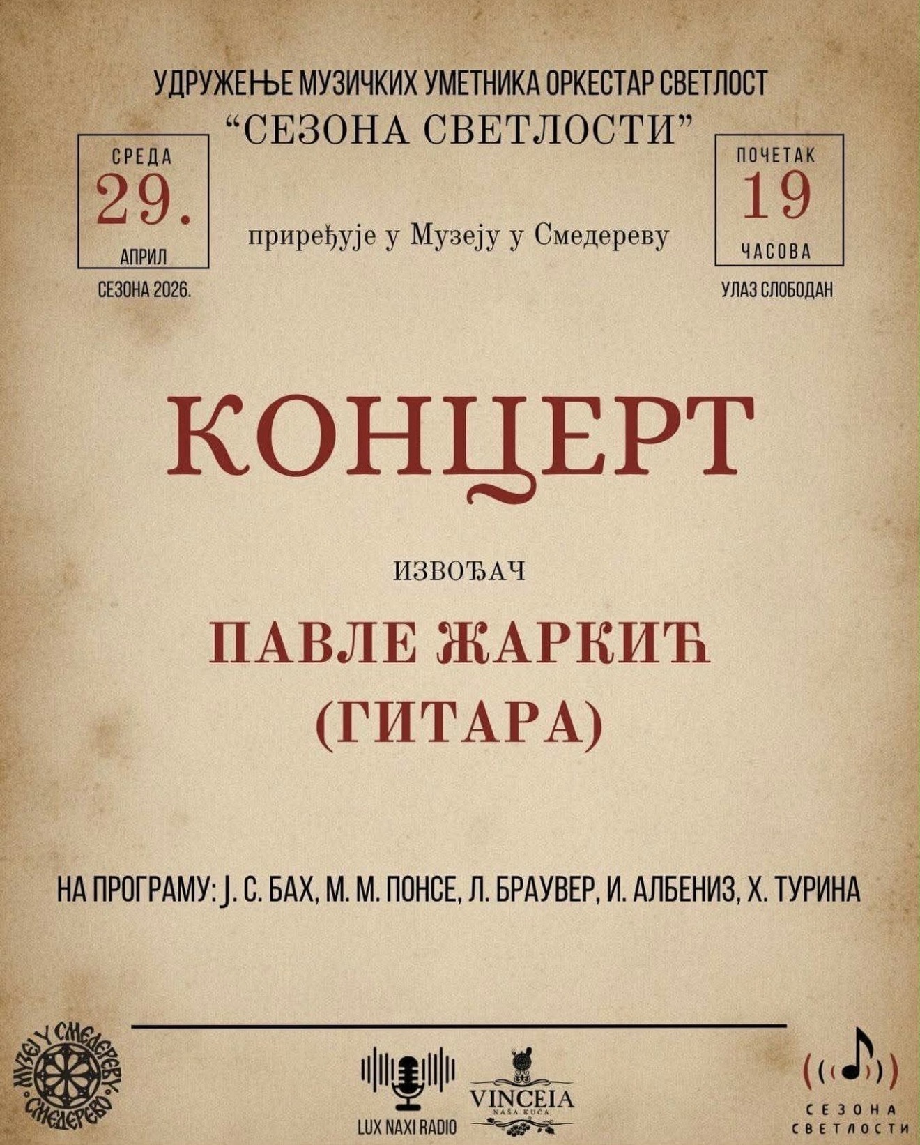 Muzej u Smederevu nastavlja sa realizacijom programa za ljubitelje različitih umetnosti, žanrova i pravaca. Večeras od 19 časova u Muzeju, u okviru „Sezone svetlosti“, nastupa gitarista Pavle Žarkić. Publiku očekuje veče kamerne muzike i vrhunskih interpretacija. Ulaz je slobodan.