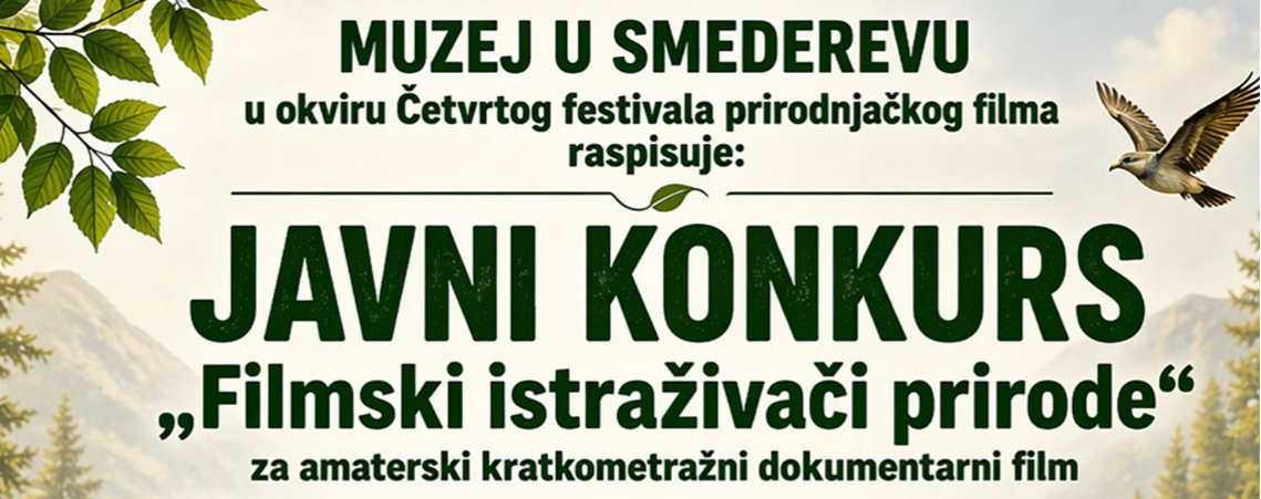 Музеј у Смедереву позива све љубитеље природе и филма да учествују у јединственом конкурсу посвећеном истраживању и очувању природног света. Кроз краткометражни документарни филм, учесници имају прилику да изразе своју креативност и укажу на значај екологије. Награђени филмови биће приказани на Четвртом фестивалу природњачког филма, који ће бити одржан у новембру 2026. године.