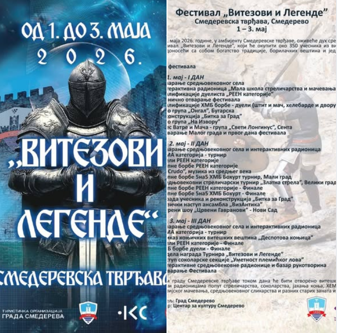Смедеревска тврђава ће од 1. до 3. маја 2026. године постати позорница живе историје на фестивалу „Витезови и легенде”, у организацији Удружења Бели Орлови. Фестивал окупља учеснике из 13 удружења из Србије, као и госте из преко 20 европских и светских земаља који ће заједно подићи аутентично средњовековно село, уз богат програм за све генерације: радионице старих заната (ковање, калиграфија, мозаик, сарачка радионица), дечије играонице, средњовековни базар, соколарске приказе „Уметност племићког лова“, као и турнир у стреличарству „Златна стрела“. Посебан део програма чине витешке борбе у пуном оклопу по правилима…